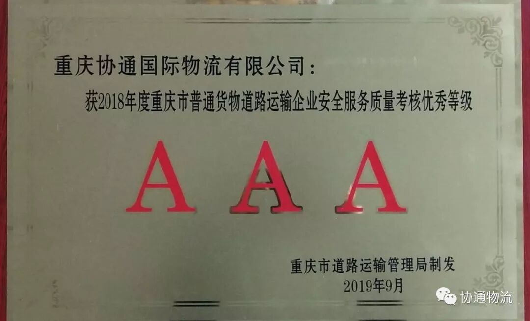 2019年9月重慶市道路運(yùn)輸管理局對市內(nèi)道路運(yùn)輸企業(yè)在2018年安全服務(wù)質(zhì)量表現(xiàn)突出的企業(yè)進(jìn)行了表彰和授牌,重慶協(xié)通國際物流有限公司被授予“AAA”。